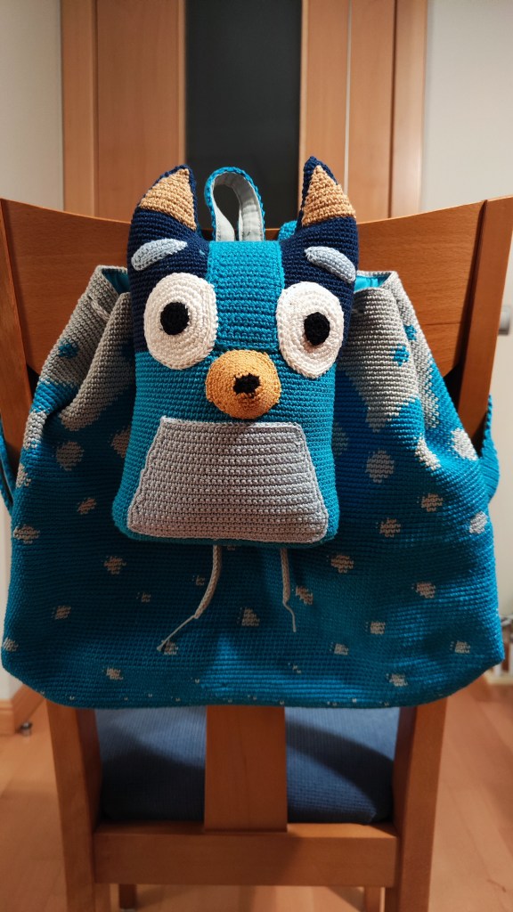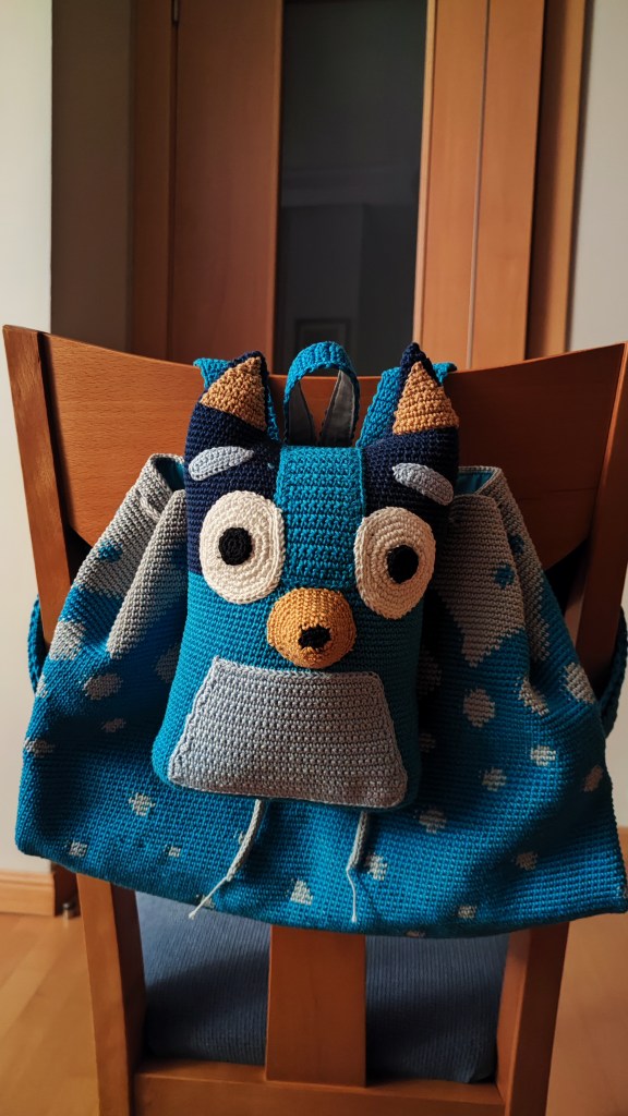 Tengo 3 sobrinos y los que me seguís seguro que sabéis que los 2 mayores ya tienen su mochila, el primero de Baby Yoda y la segunda de Minie. Pues me quedaba el pequeño, auténtico fan de Bluey. Y esta vez, me ha tocado inventar un poco porque no he encontrado ninguna en la que inspirarme, así que, a ver si os gusta…