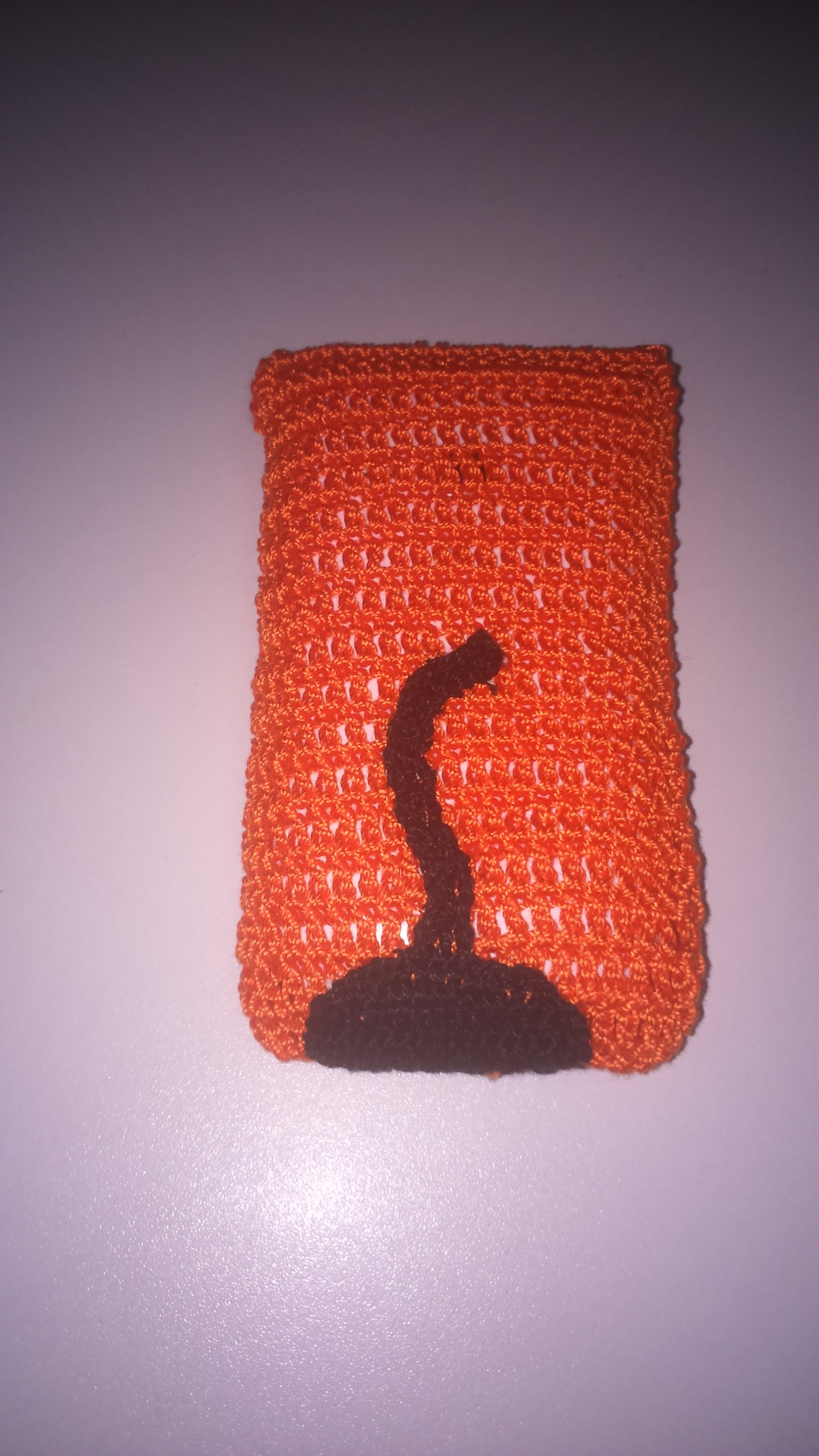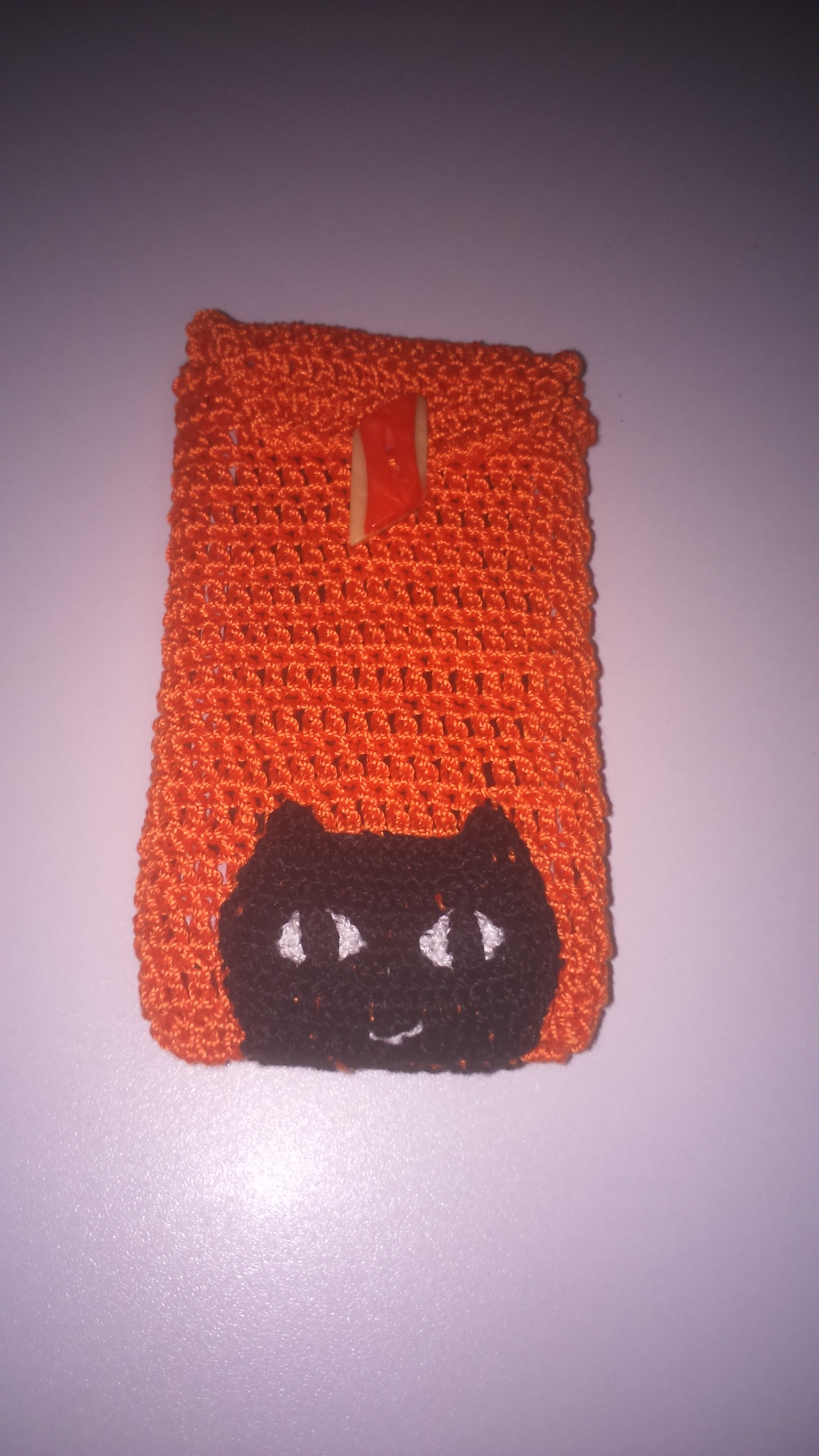 Diseño exclusivo de funda de móvil. En la parte delantera, tenemos la cara de un gatito negro sobre fondo naranja, y en la parte trasera, la cola. Ha quedado bien, ¿verdad?
