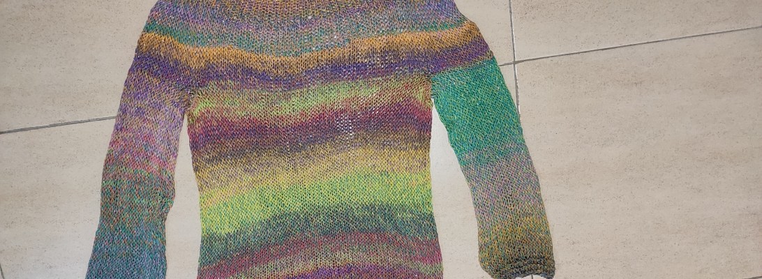Me enamoré de un jersey o más bien… me enamoré de una lana. Y entonces decidí hacer el jersey siguiendo las instrucciones del patrón. Y o bien, yo soy un poco torpe, o hago punto muy flojo, cabían 2 o 3 como yo en el primero que hice, y menos mal que había elegido la talla S. Así que después del desastre, de hacer y deshacer unas cuantas veces, 3 meses después de lo previsto, ahora cuando ya hace calor y no lo puedo estrenar, aquí está… ¿Me gusta tanto como cuando lo vi? No estoy segura, habrá que sacarlo a la calle y ver qué pasa 🙂