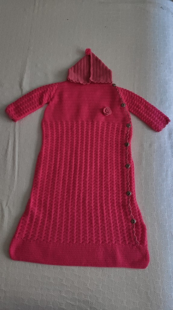 Una nueva sobrina está en camino y nace en pleno invierno, así que le he preparado un saco de dormir bien calentito, con capucha y todo. El tamaño es de 6 a 9 meses para que lo pueda usar bastante tiempo, seguro que ahora le queda grande pero enseguida se lo podrá poner.