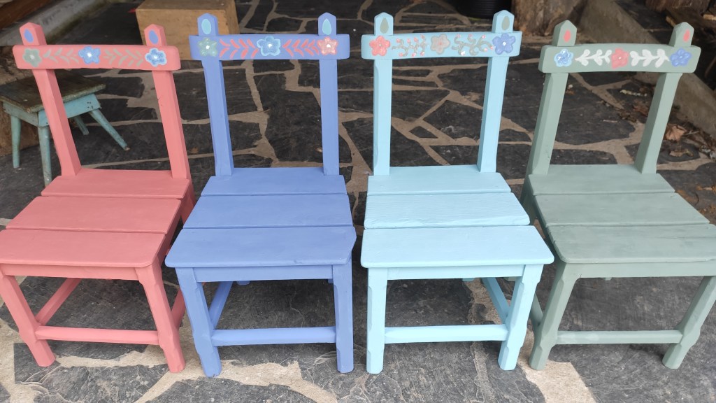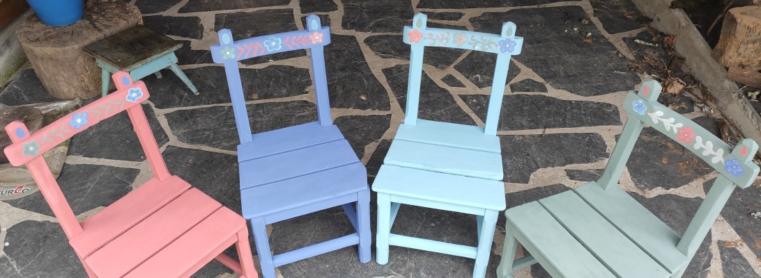Otra de mis aficiones es pintar. Me encontré estas sillas de madera en mal estado y después de trabajarlas, decidí pintar cada una de un color con un pequeño detalle basado en flores. ¿Os gustan?