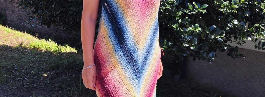 Por aquí va la primera labor que me ha llevado su tiempo, es un vestido de ganchillo que prácticamente he ido tejiendo sobre mi cuerpo, por lo que lo de hacer y deshacer ha sido mi rutina ya que además, se teje prácticamente de una pieza, no lleva costuras, gira sobre el cuerpo. Ha sido todo un reto pero creo que el resultado está muy bien. Si a esto le sumamos un hilo de Katia multicolor, añadimos un punto de vistosidad que no conseguiríamos con un hilo clásico. Os dejo fotos por aquí y ya me decís si os gusta :-).