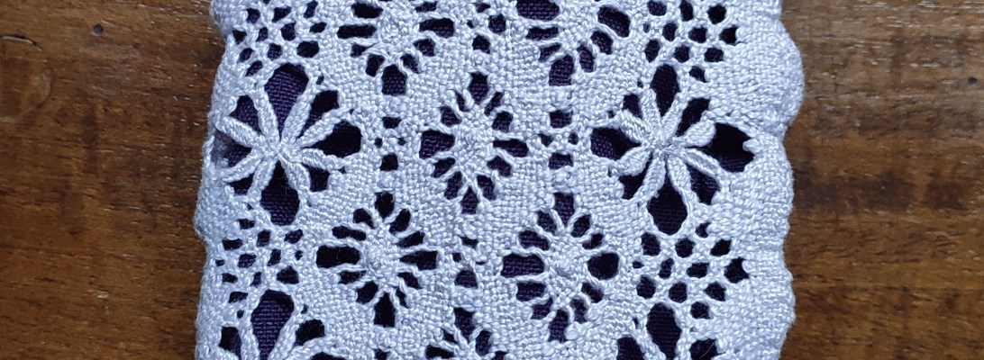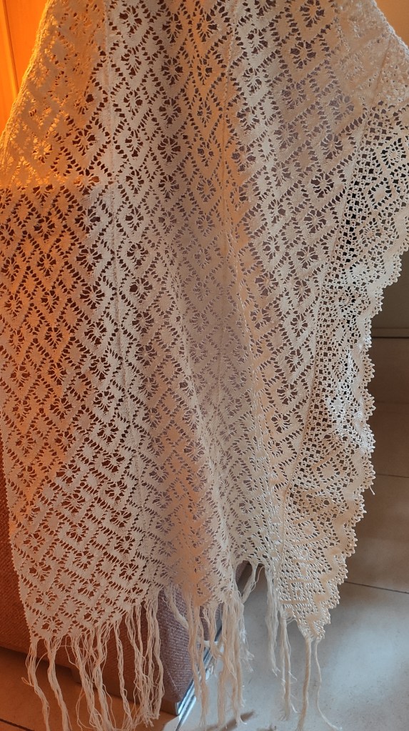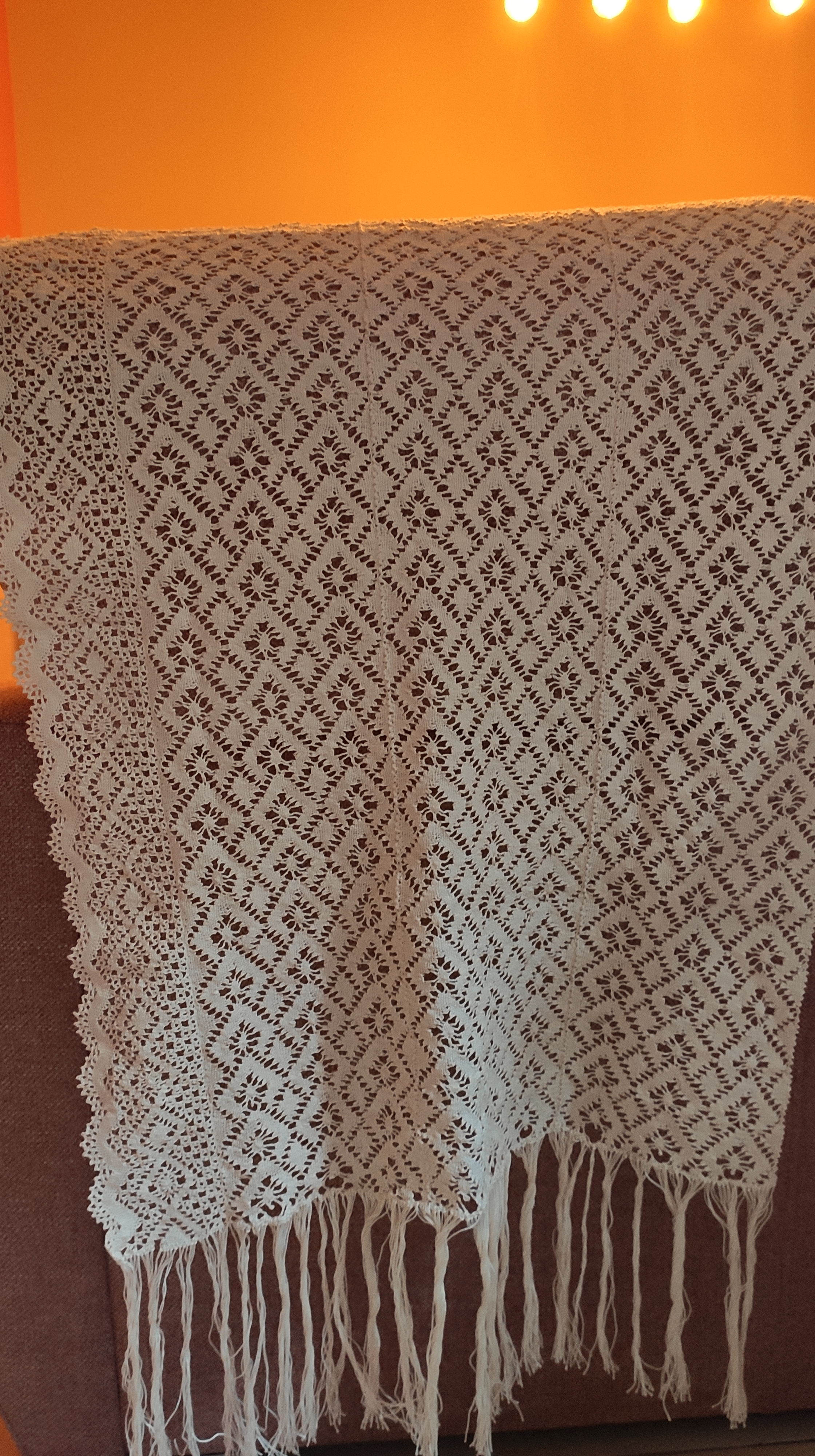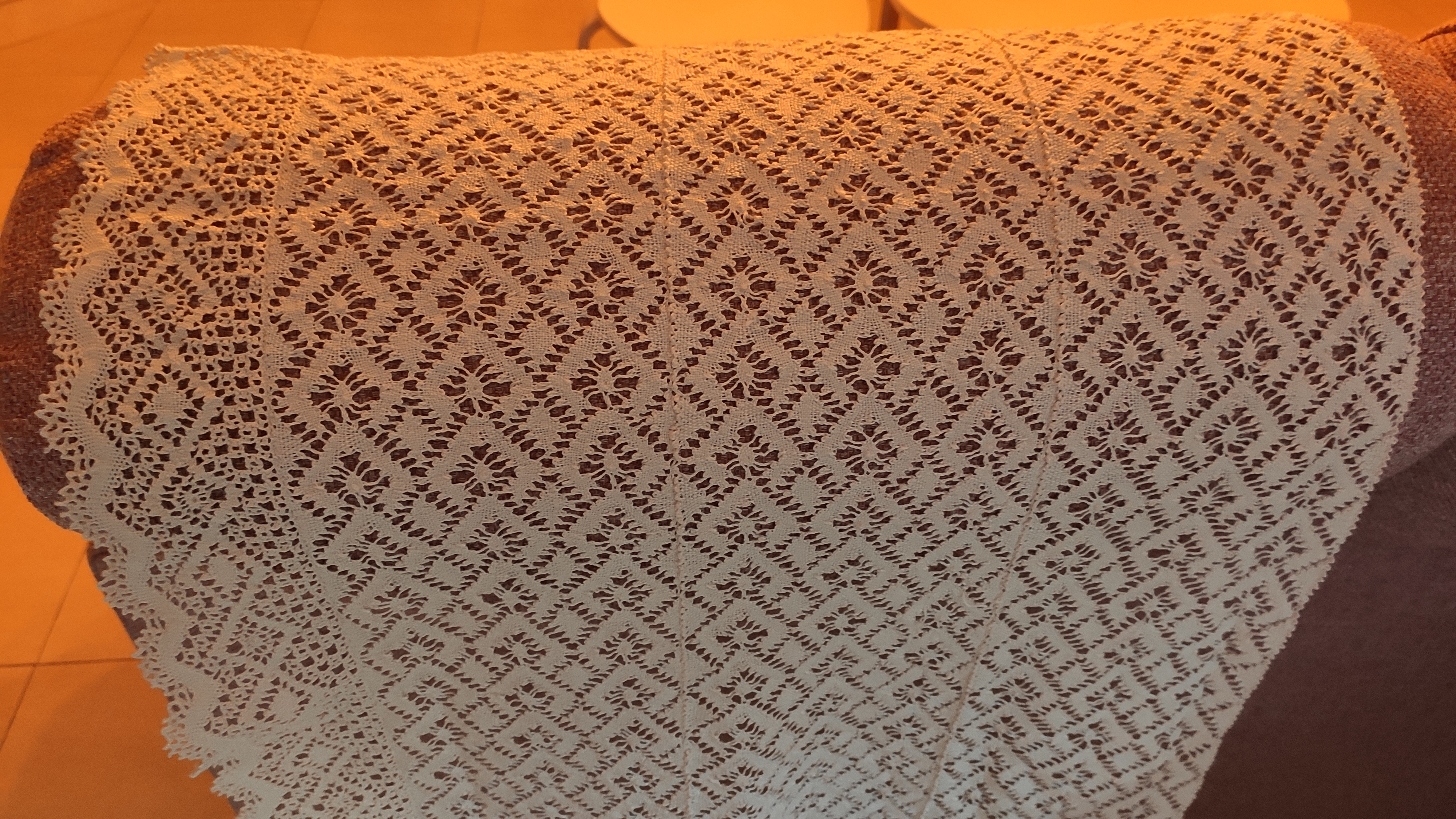 Hacía tiempo que tenía ganas de hacerme un chal de encaje de bolillos pero no encontraba un diseño que me llamase la atención hasta que vi este que acabo de realizar. Está hecho con 3 tiras más un borde porque si lo realizaba con 4 tiras me parecía demasiado ancho, y con 3 se me quedaba un poco escaso, así que tuve que buscar un remate que más o menos encajase con el resto del diseño y a la vez, destacase un poco.
