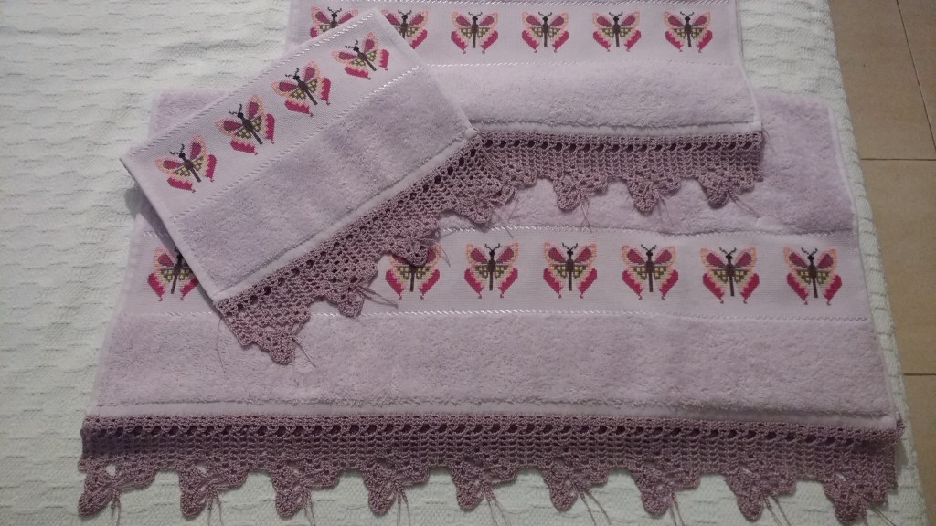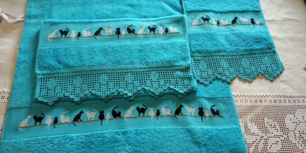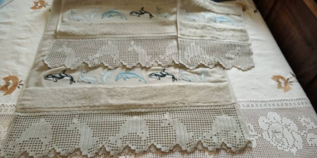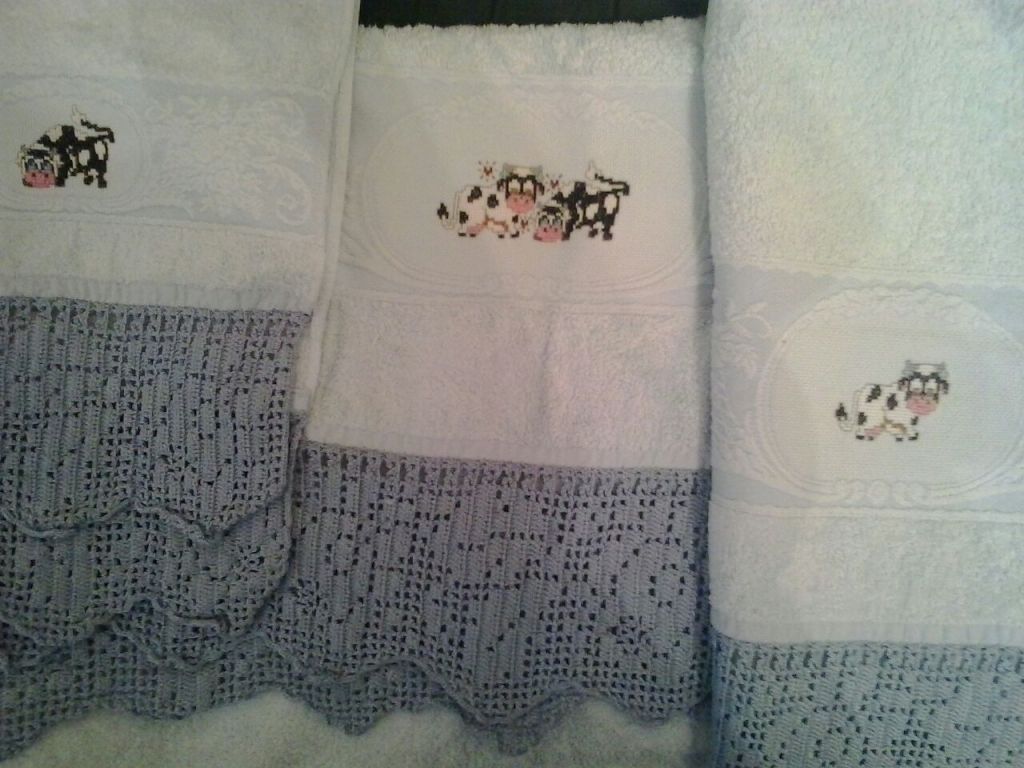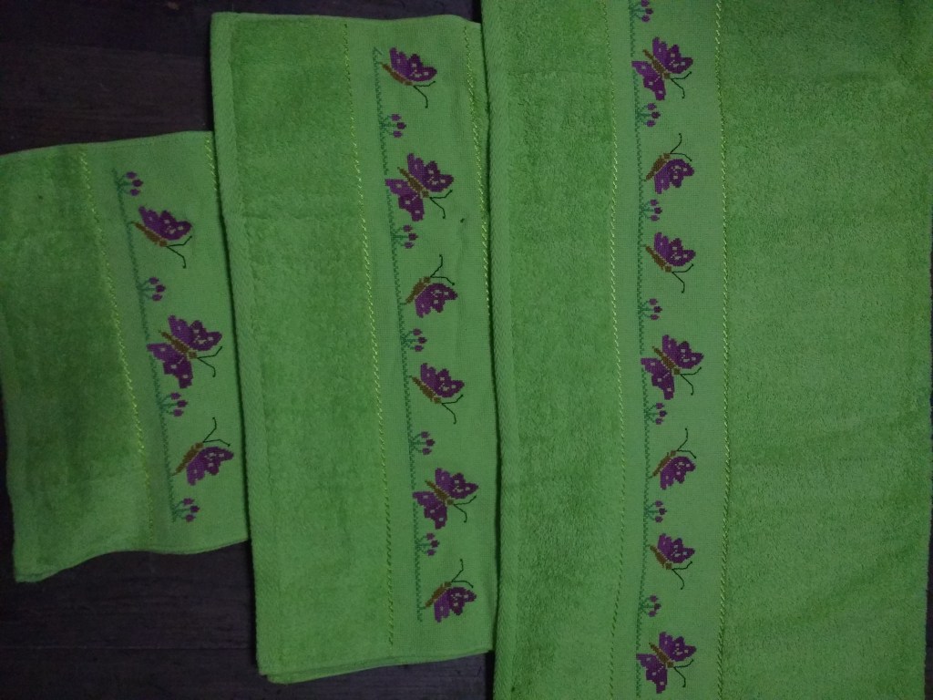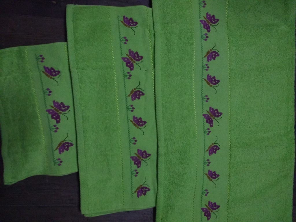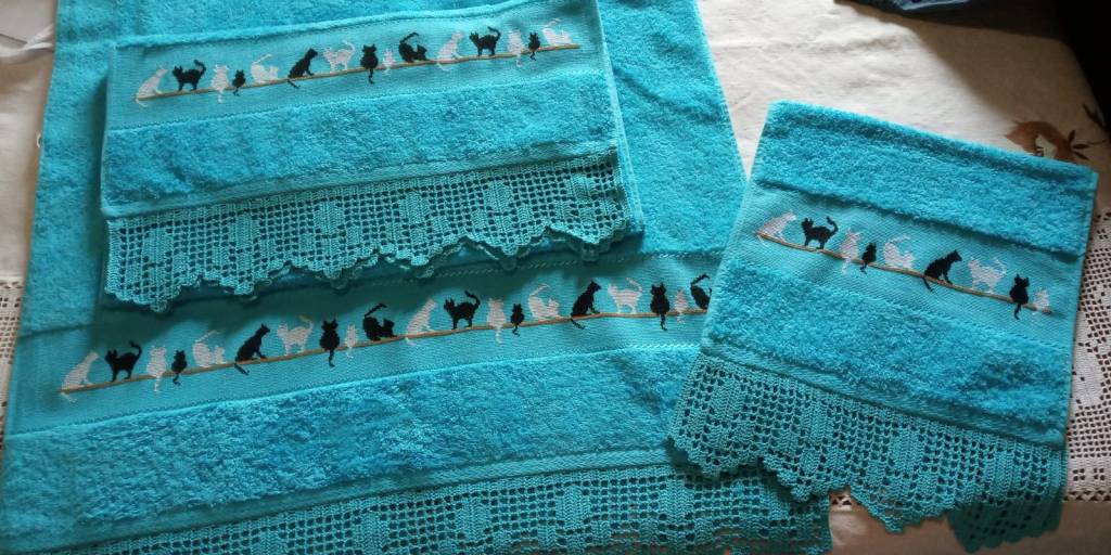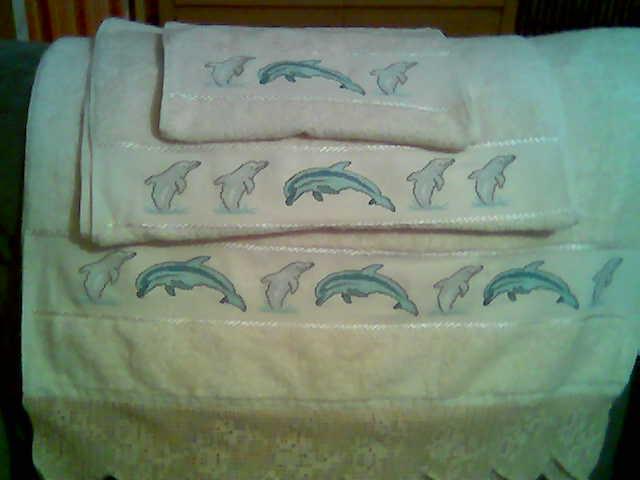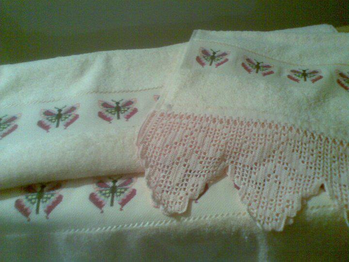 Toallas de punto de cruz y ganchillo. Juego completo: 80€