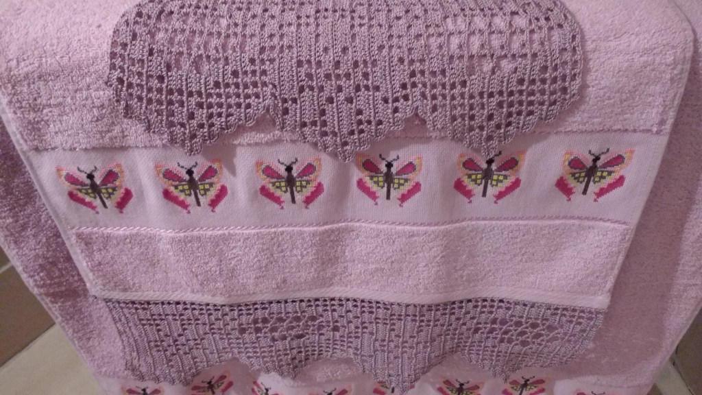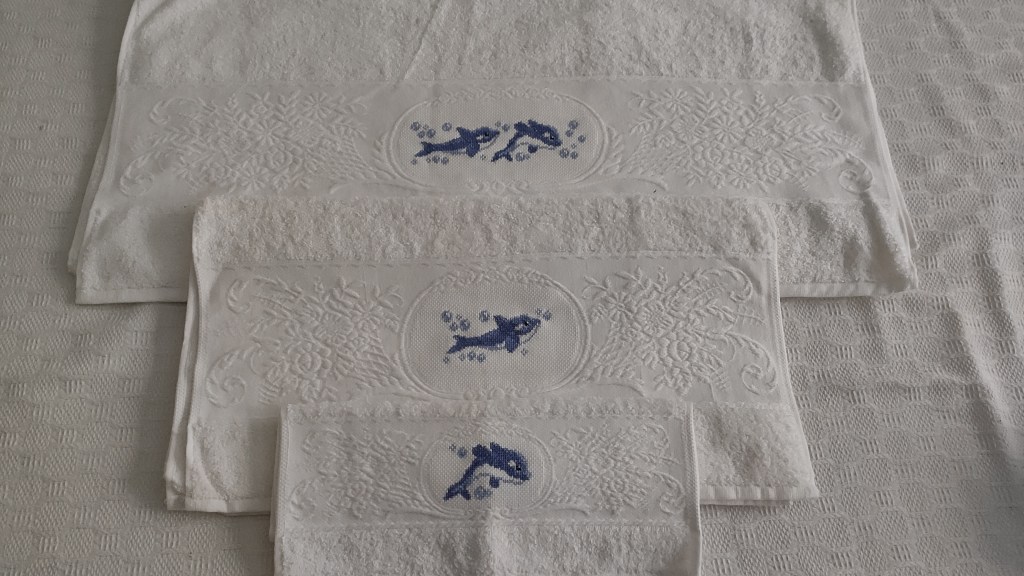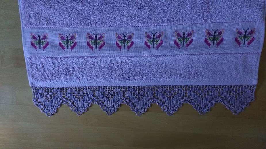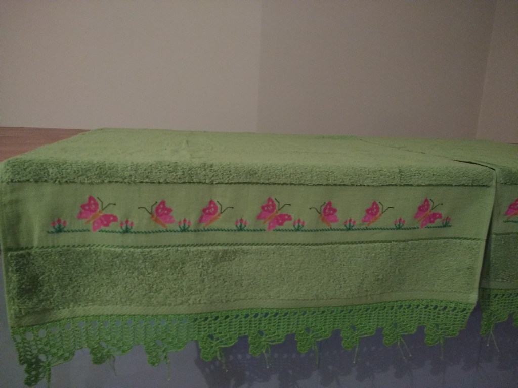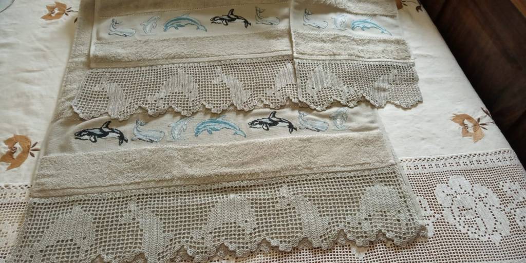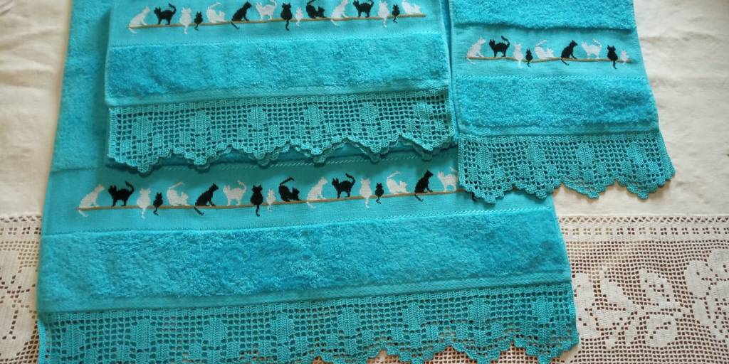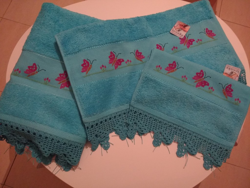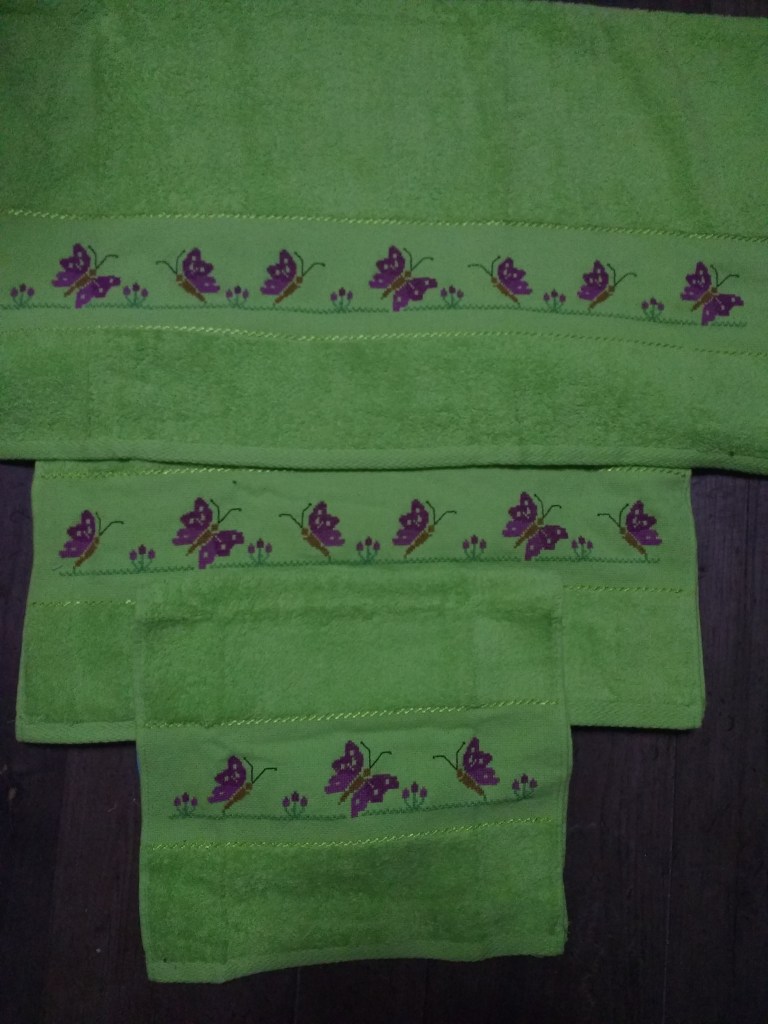 Toallas de punto de cruz y ganchillo. Juego completo: 80€