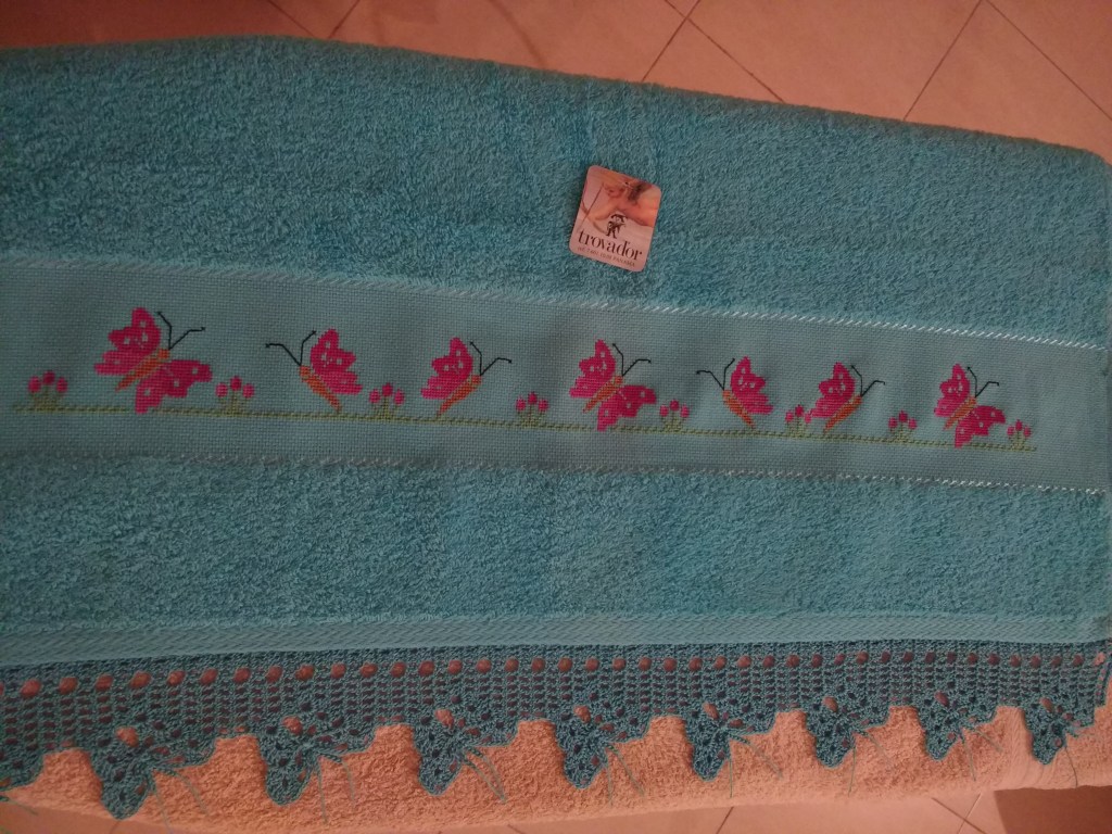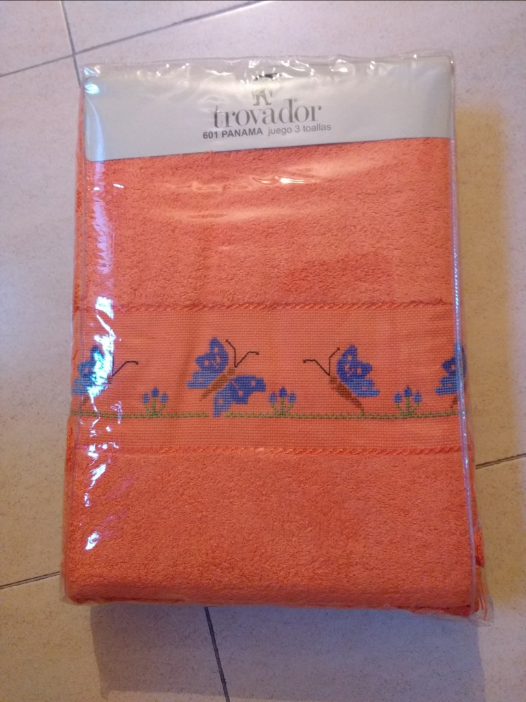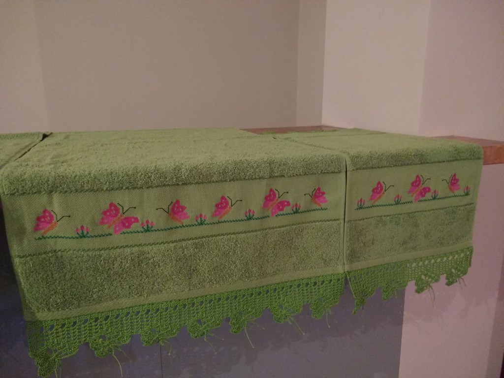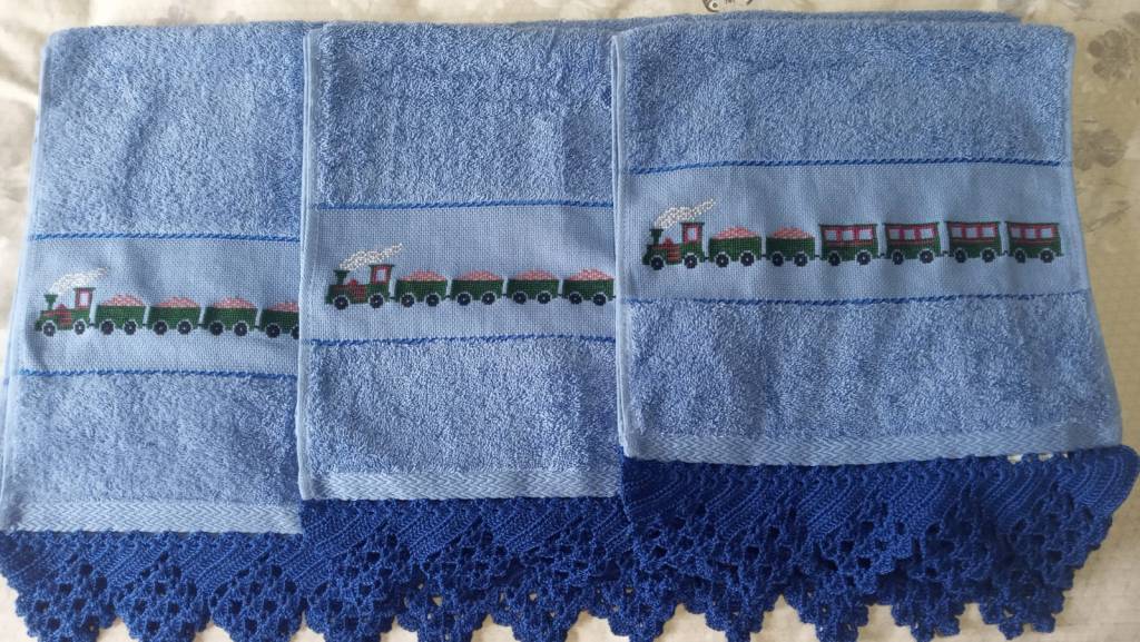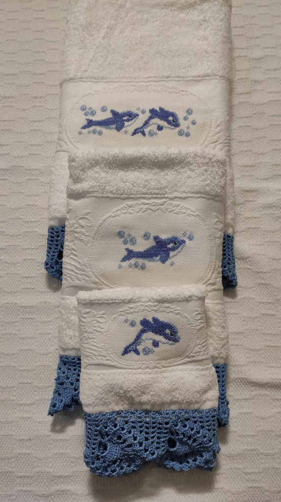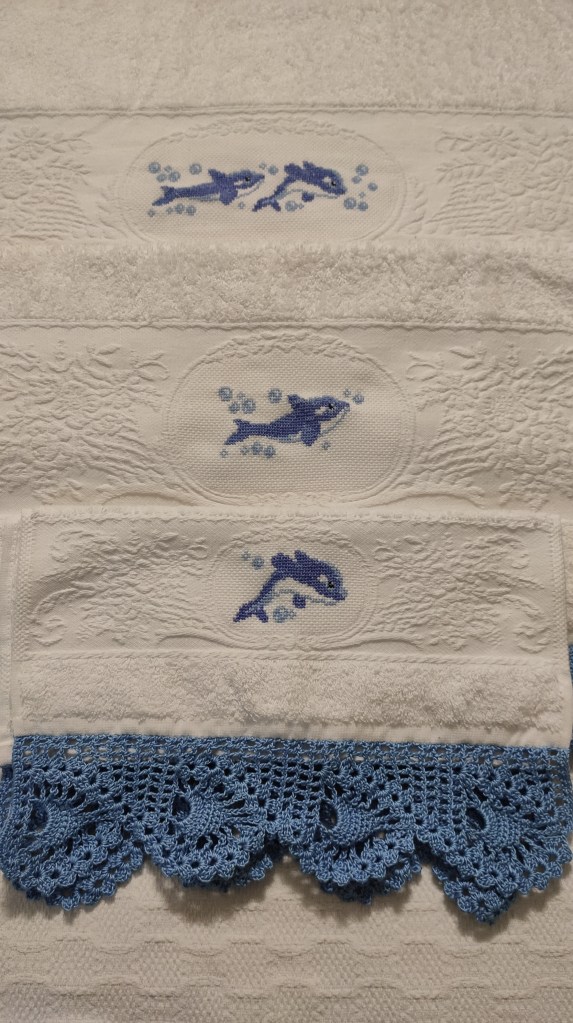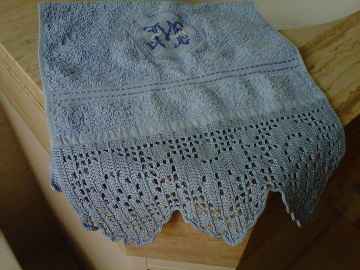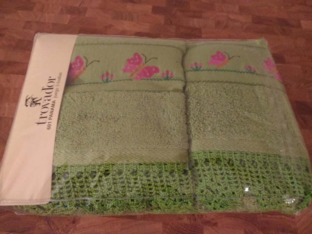 Toallas de punto de cruz y ganchillo. Juego completo: 80€
