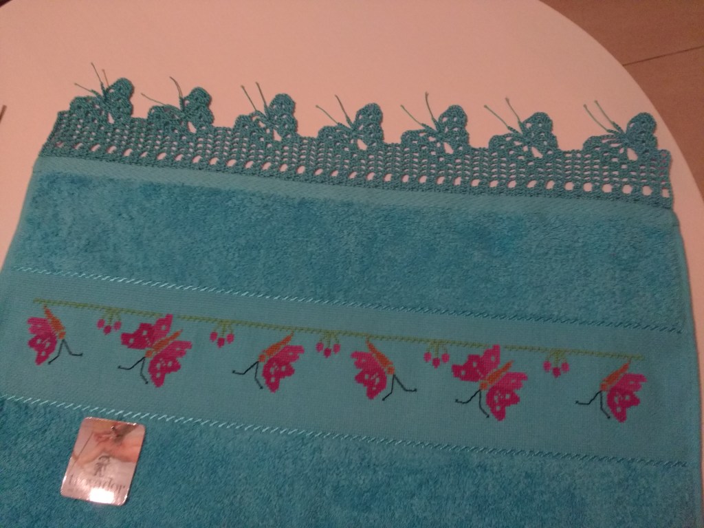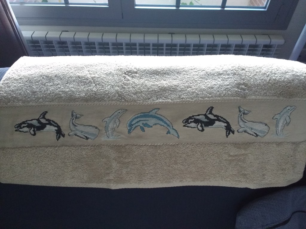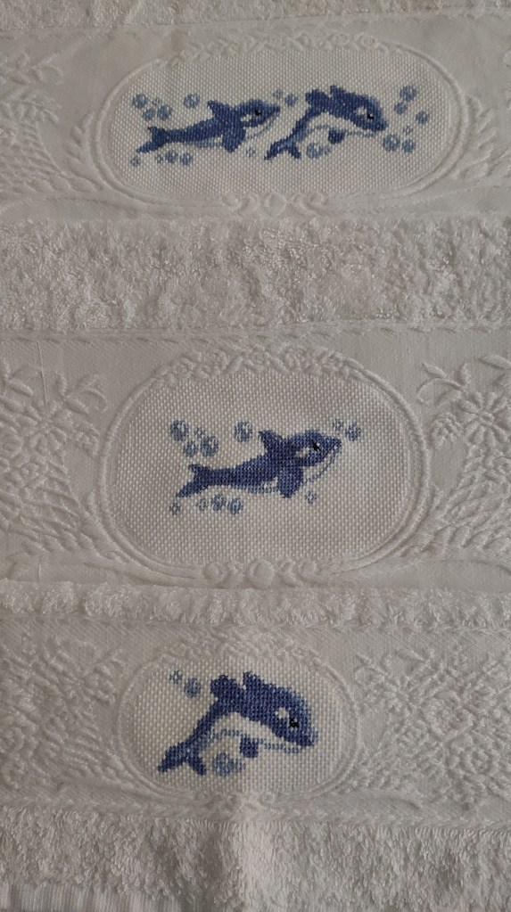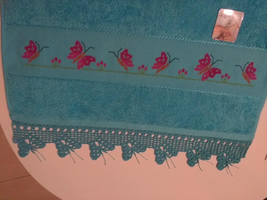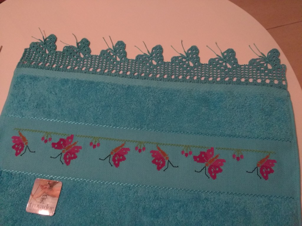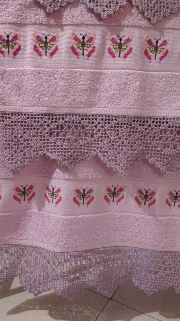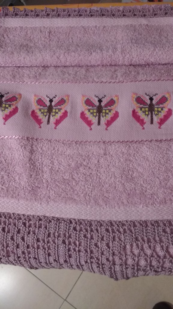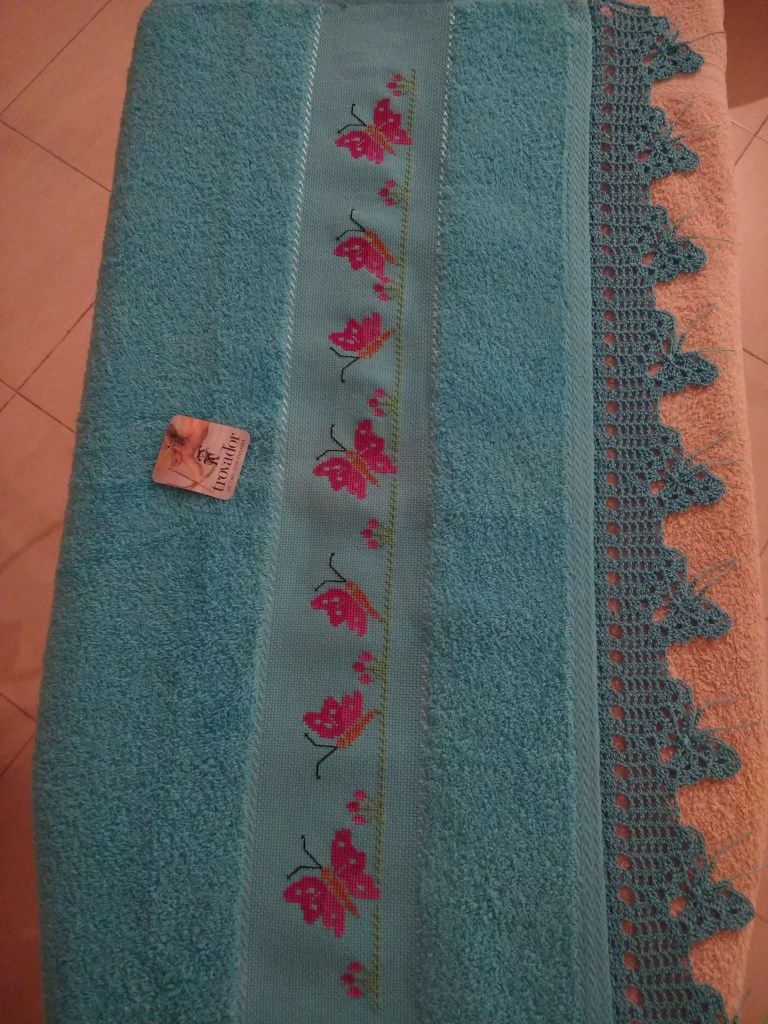 Toallas de punto de cruz y ganchillo. Juego completo: 80€