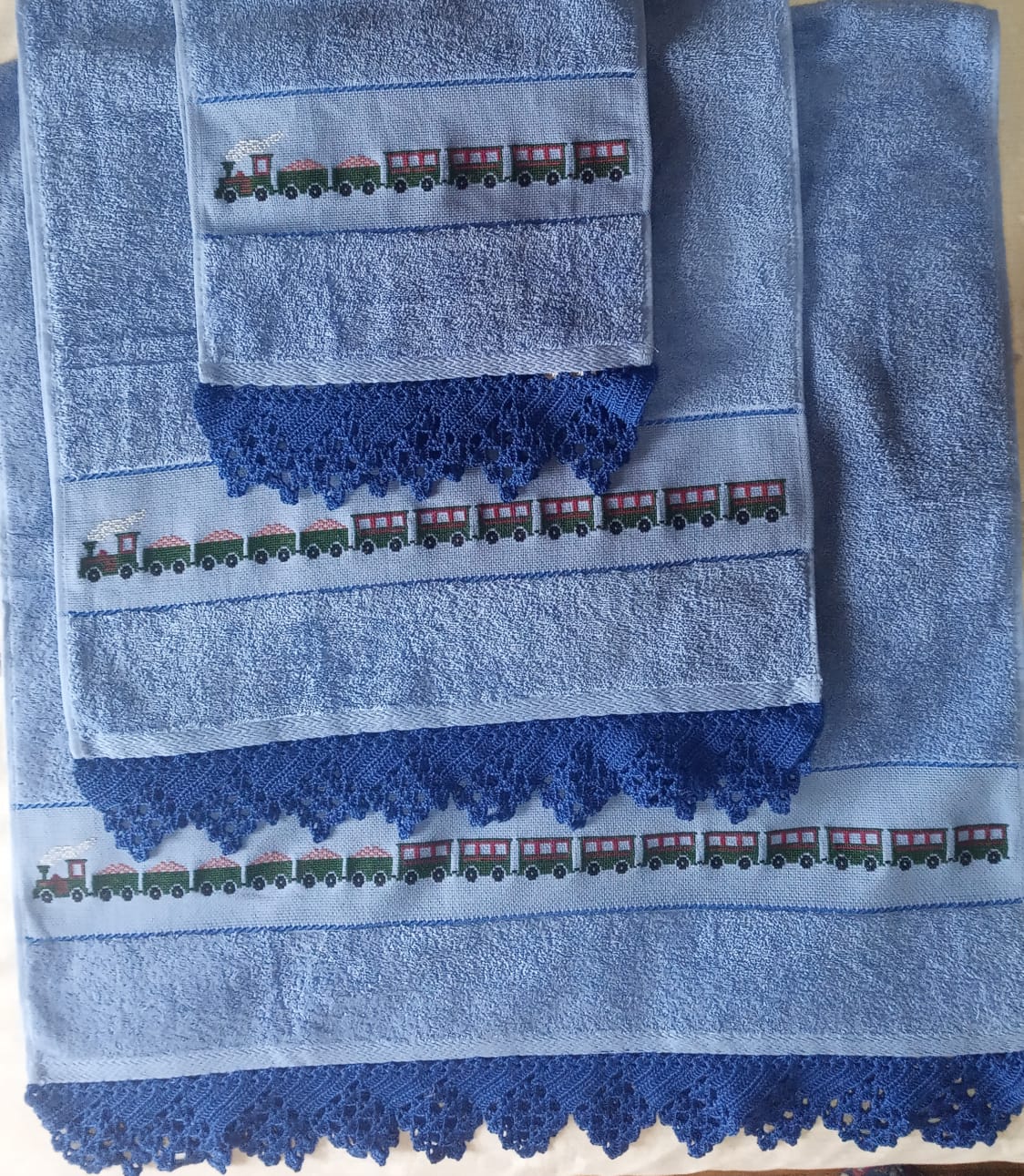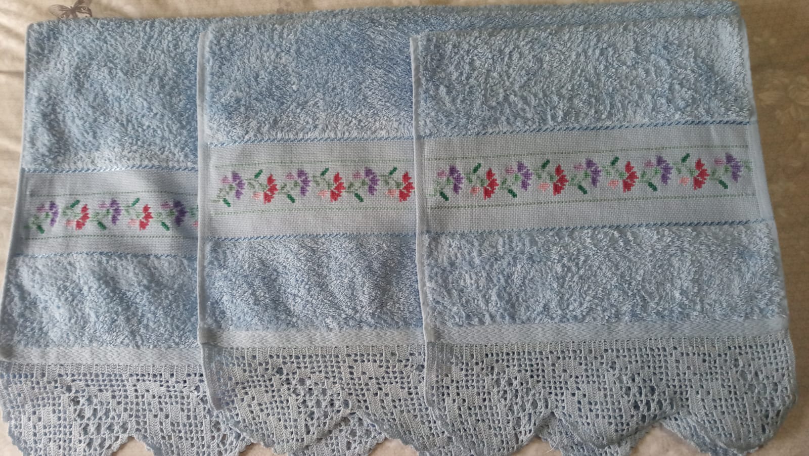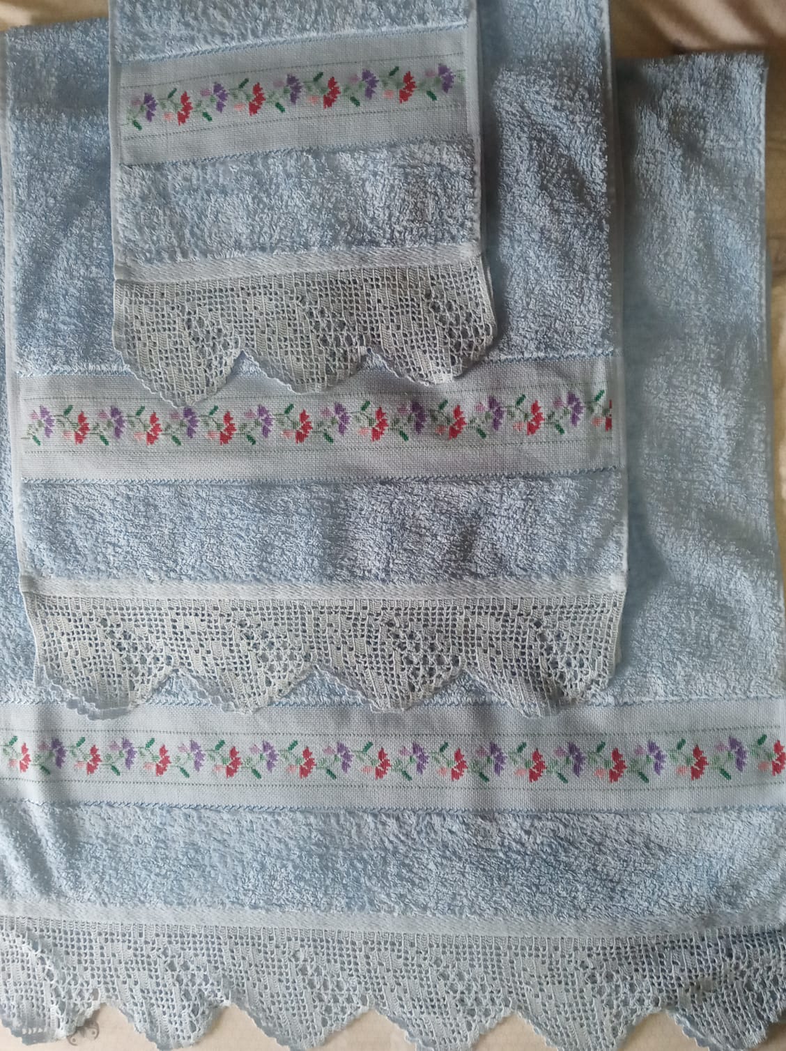 Toallas de punto de cruz y ganchillo. Juego completo: 80€